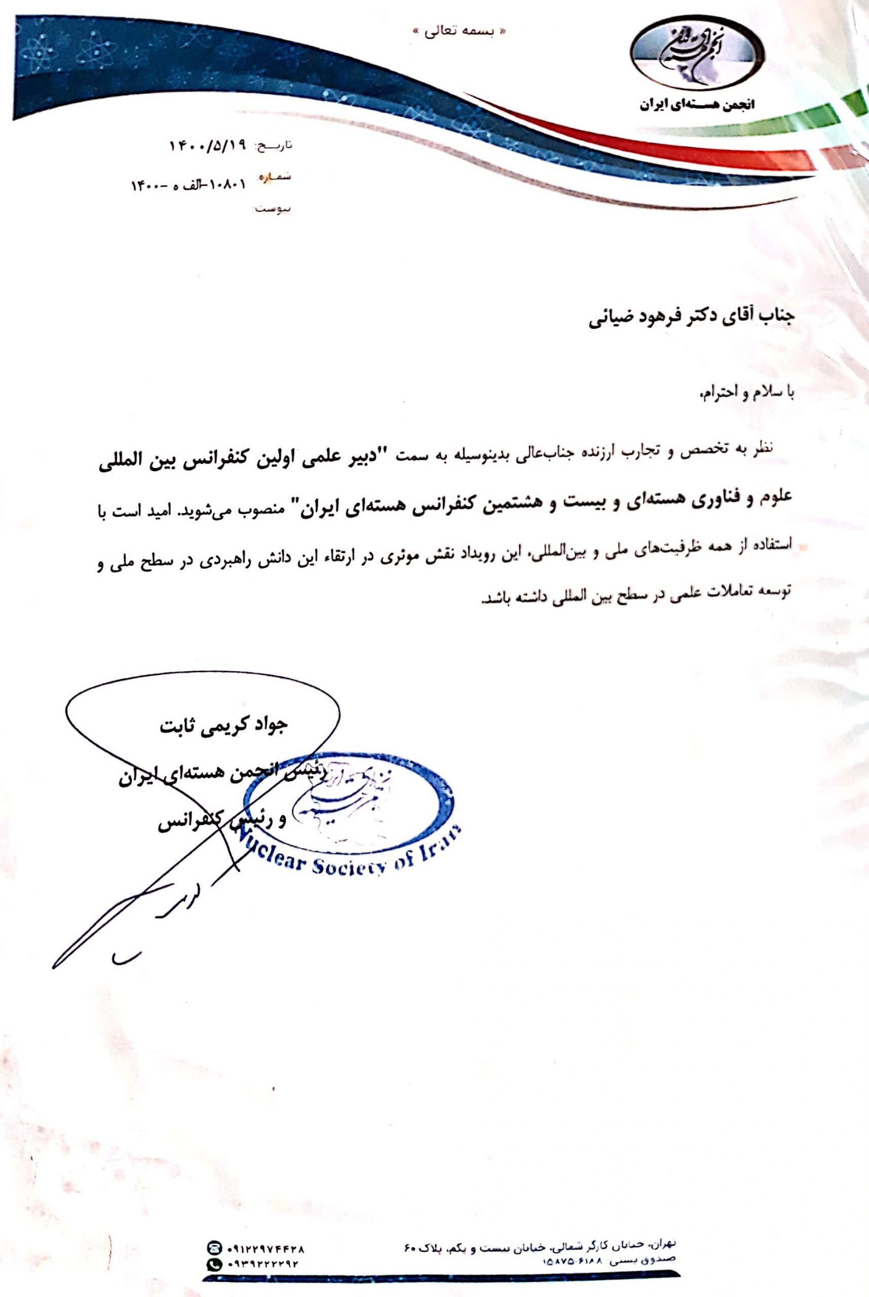 - دبیر کمیته علمی اولین کنفرانس بینالمللی و بیست و هشتمین کنفرانس ملی علوم و فناوری هستهای 1400