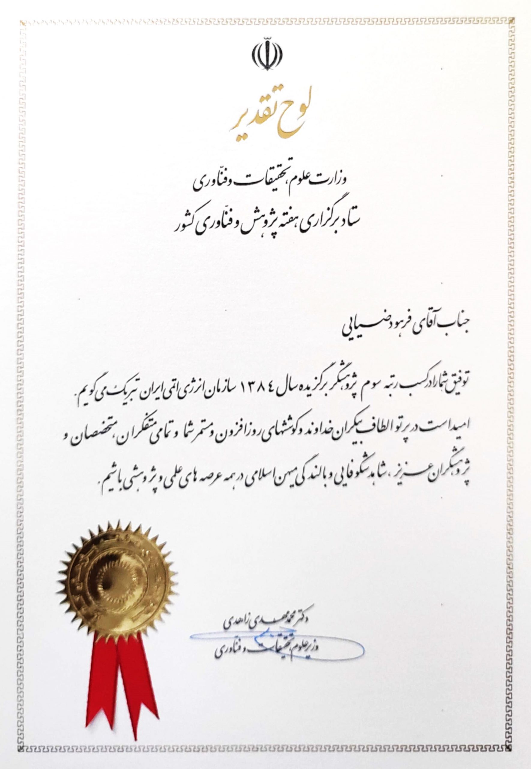 - پژوهشگر برتر سازمان انرژی اتمی ایران، وزارت علوم تحقیقات و فناوری، 1384