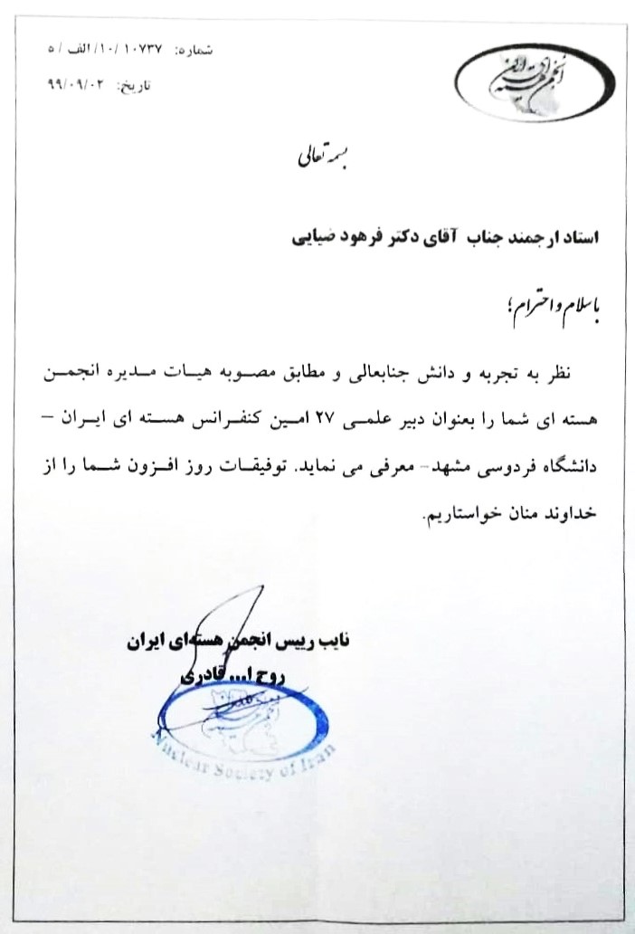 - دبیر کمیته علمی بیست و هفتمین کنفرانس هستهای ایران 1399