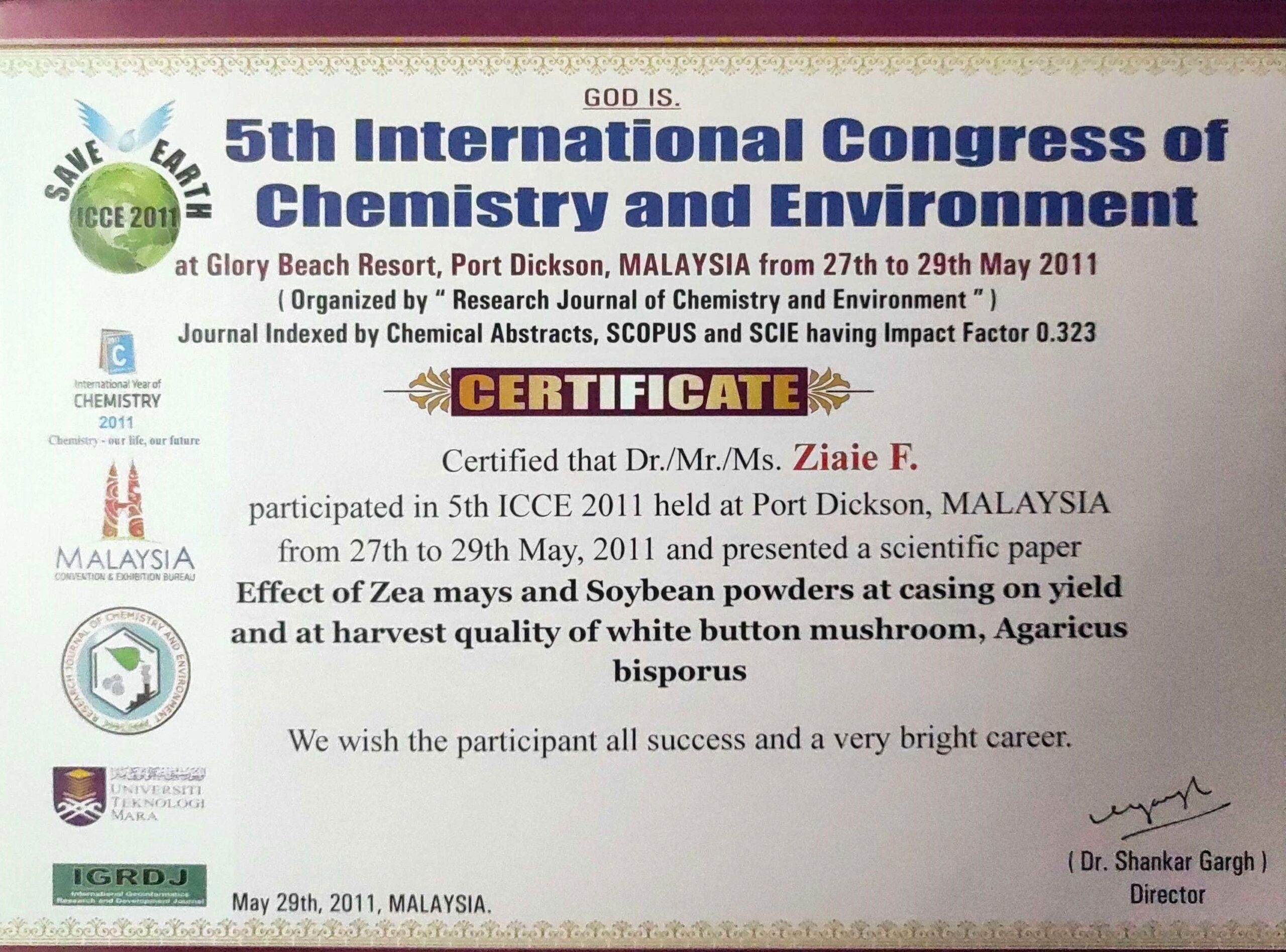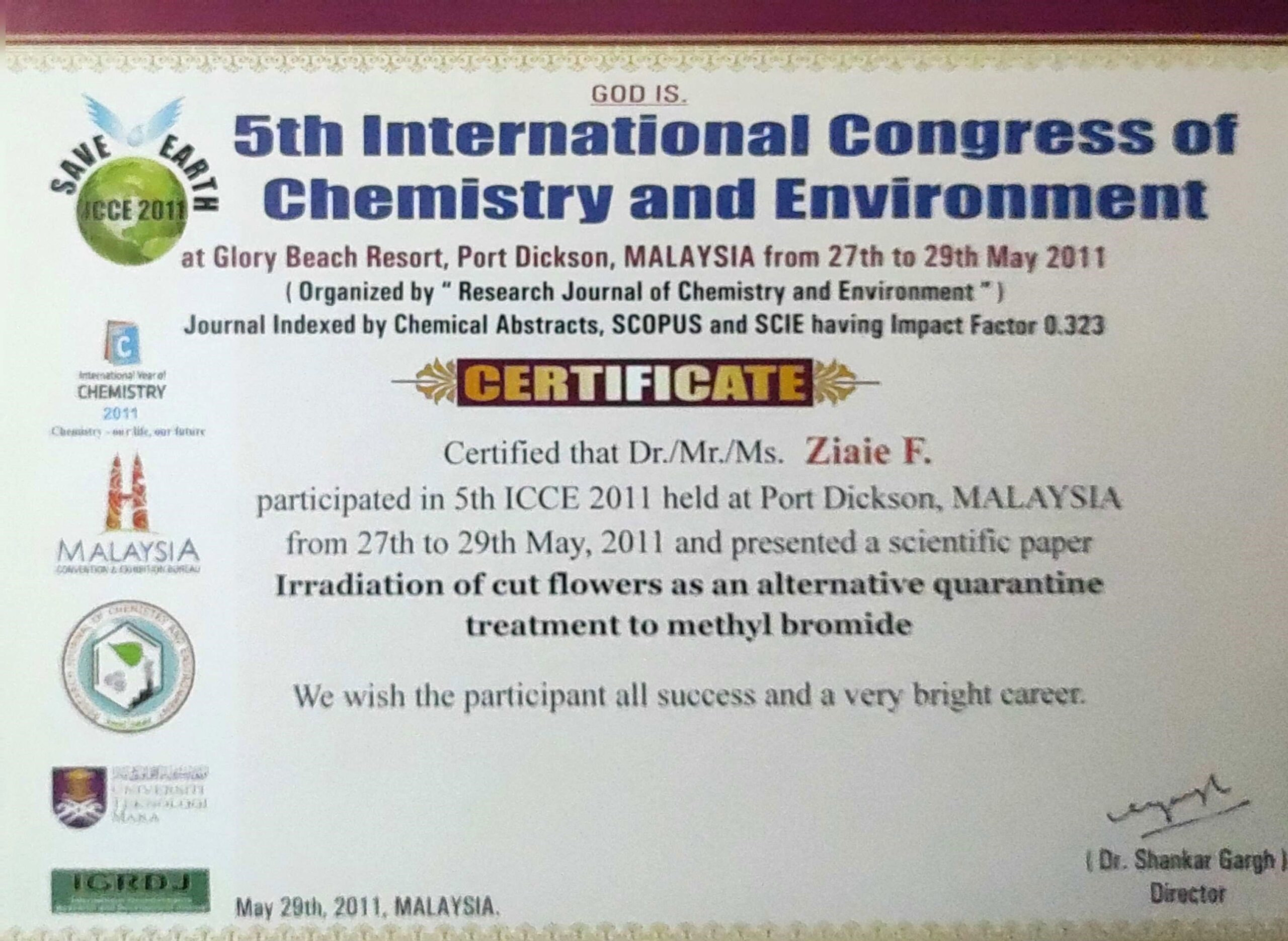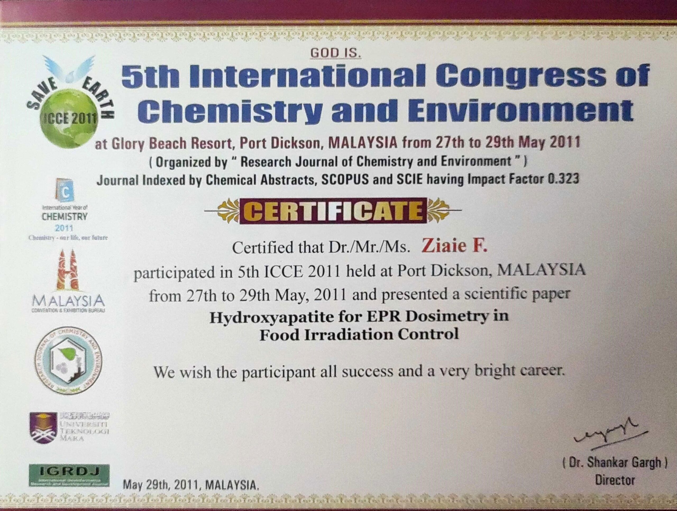 - دزیمتری با هیدروکسیاپتایت به روش EPR در پایش پرتودهی مواد غذایی، پنجمین کنگره بینالمللی شیمی و محیط زیست، کوالالامپور، مالزی، ۲۰۱۱