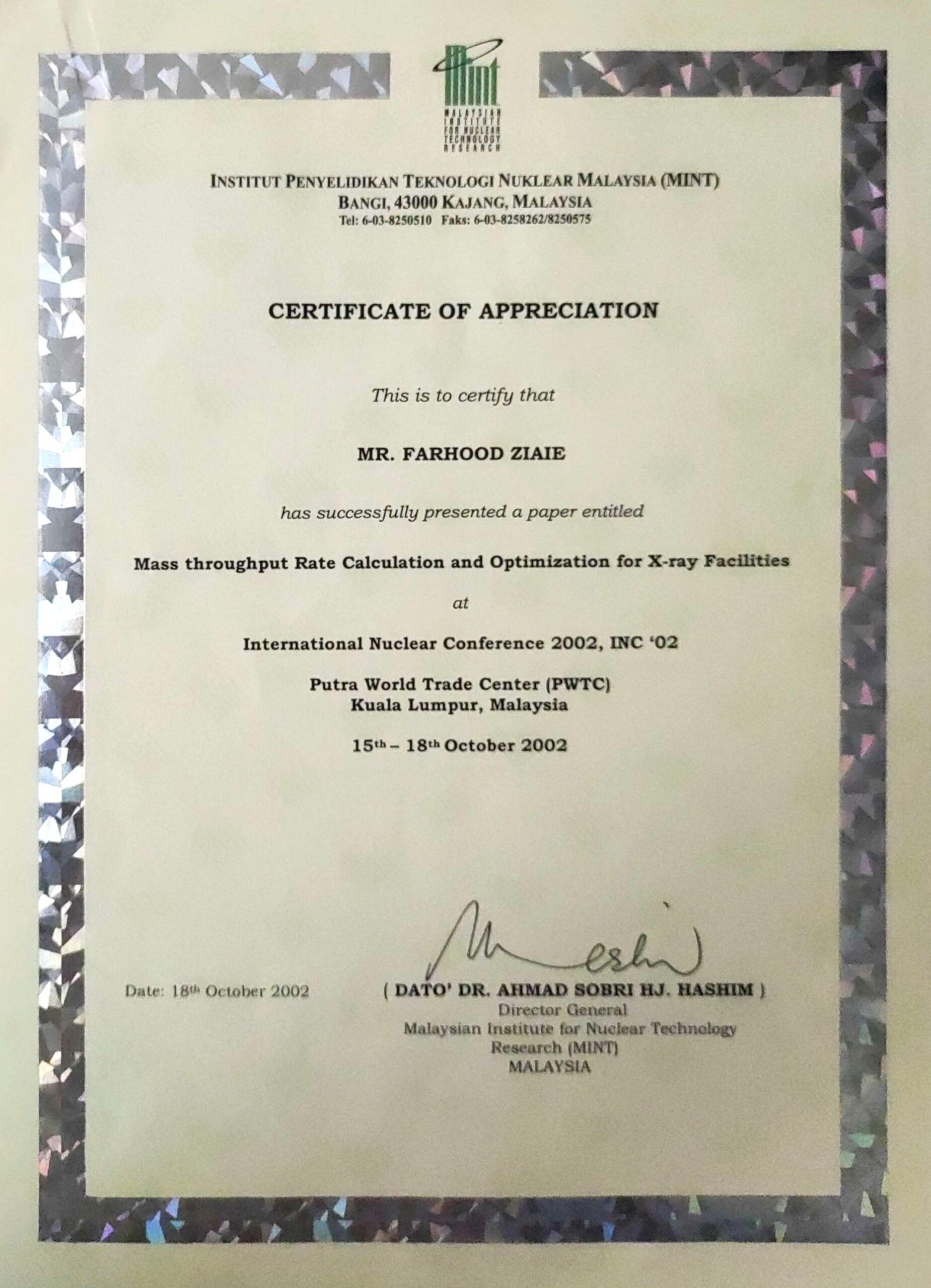 - محاسبه و بهینهسازی آهنگ گذر جرمی برای سامانه مجهز به پرتو ایکس، دومین کنفرانس بینالمللی هستهای، کوالالامپور، مالزی، 2002