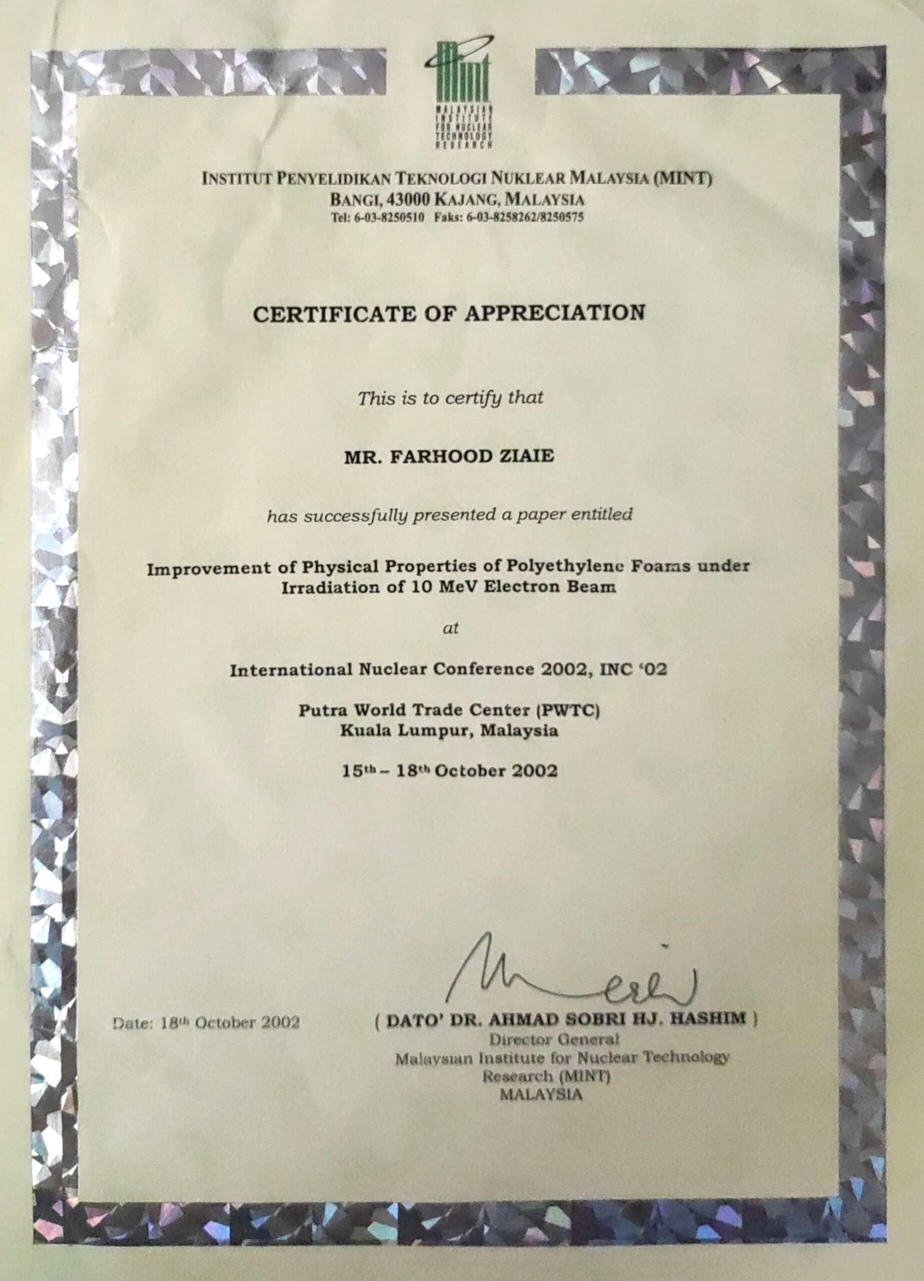 - بهبود خواص فیزیکی فوم پلیاتیلن تحت تابش باریکه الکترونهای MeV10، دومین کنفرانس بینالمللی هستهای، کوالالامپور، مالزی، 2002