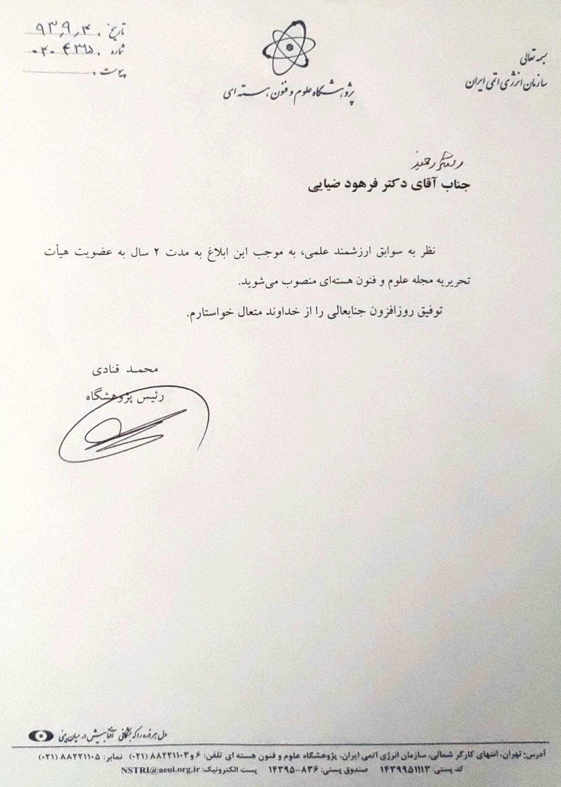 - کسب مرتبه استادی، پژوهشگاه علوم و فنون هسته ای ، 1393