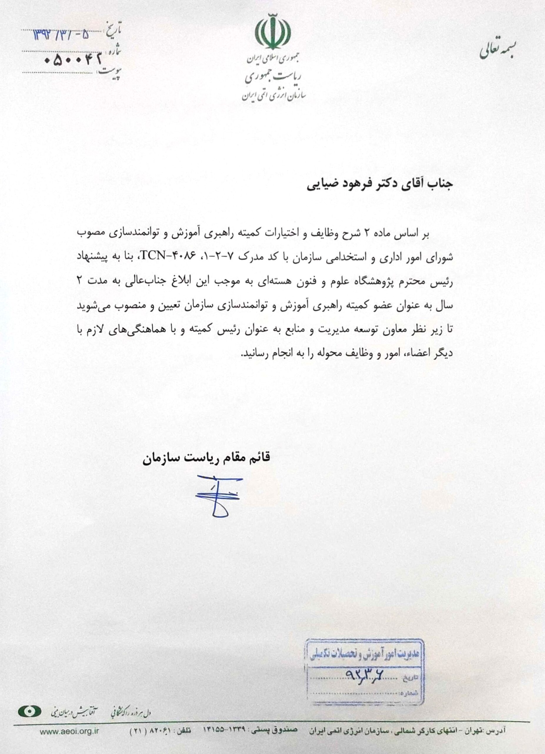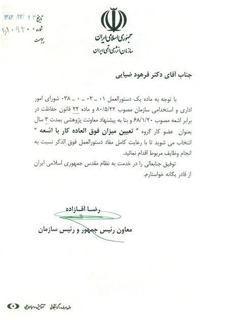 - کارگروه تعین میزان فوقالعاده کار با اشعه، سازمان انرژی اتمی ایران، 1386-1383
